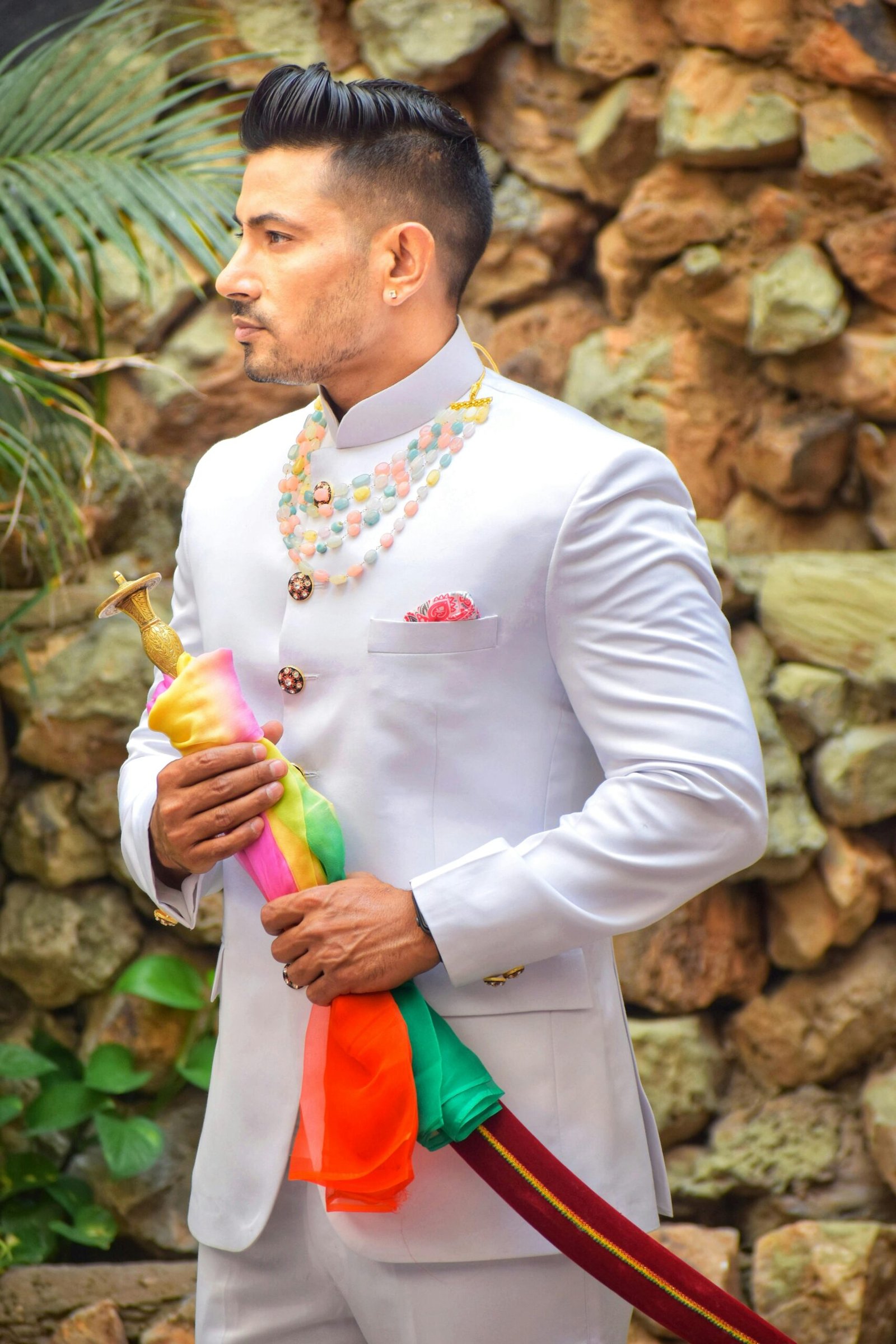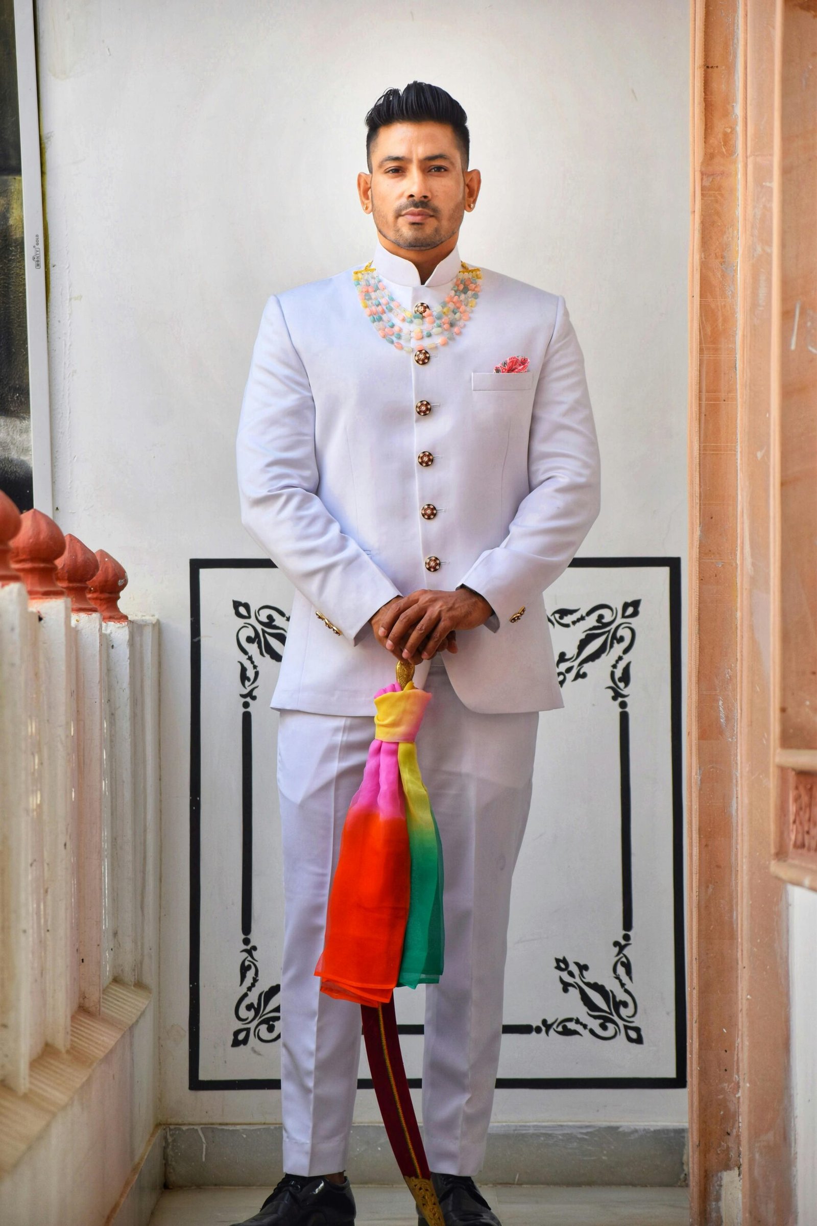 Make a bold and elegant statement with our Classic White Indo-Western Sherwani Suit with Multicolor Dupatta. Designed for the modern man who values tradition with a contemporary touch, this outfit features a tailored silhouette crafted from premium fabric for a crisp, refined finish.