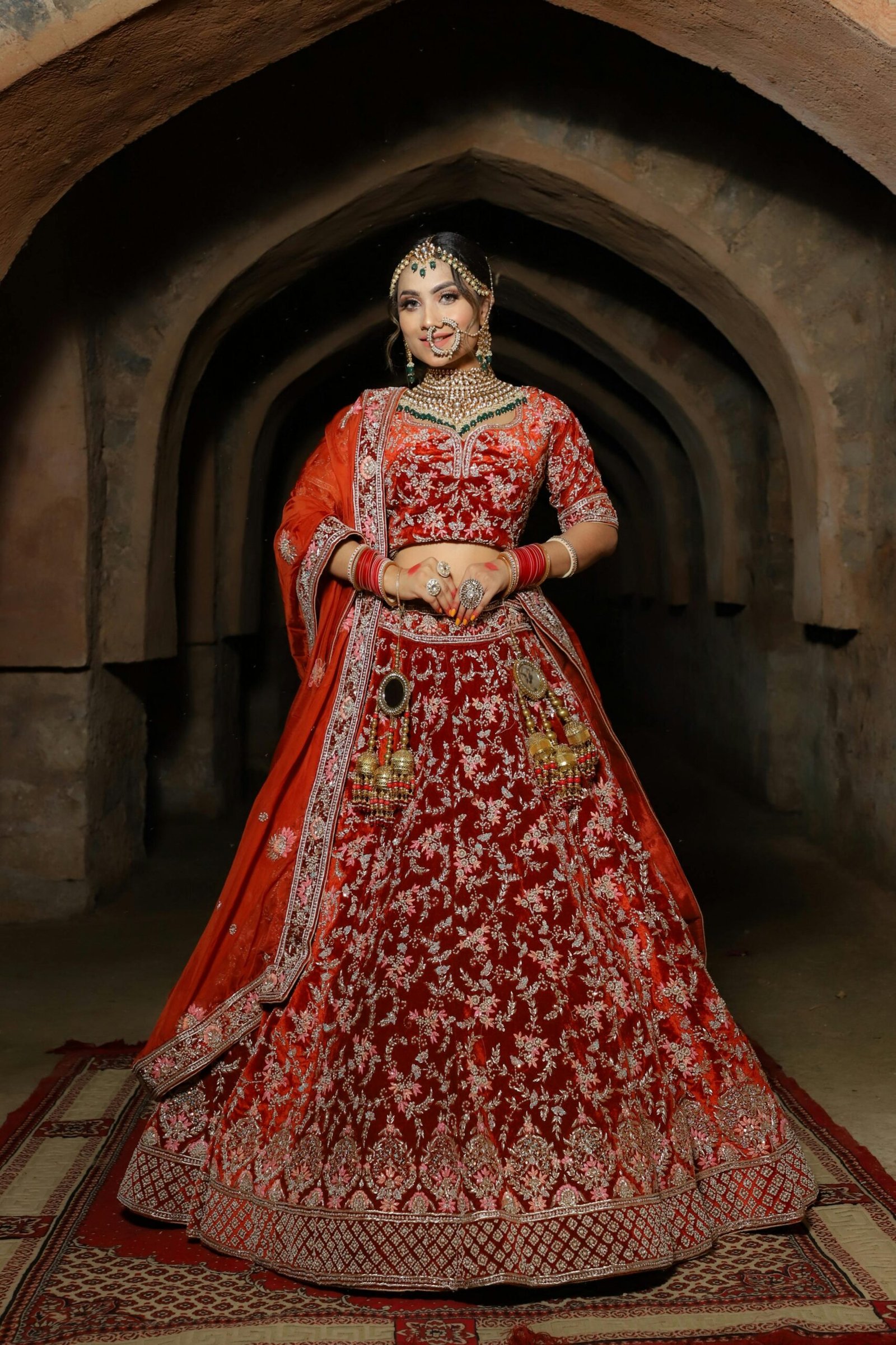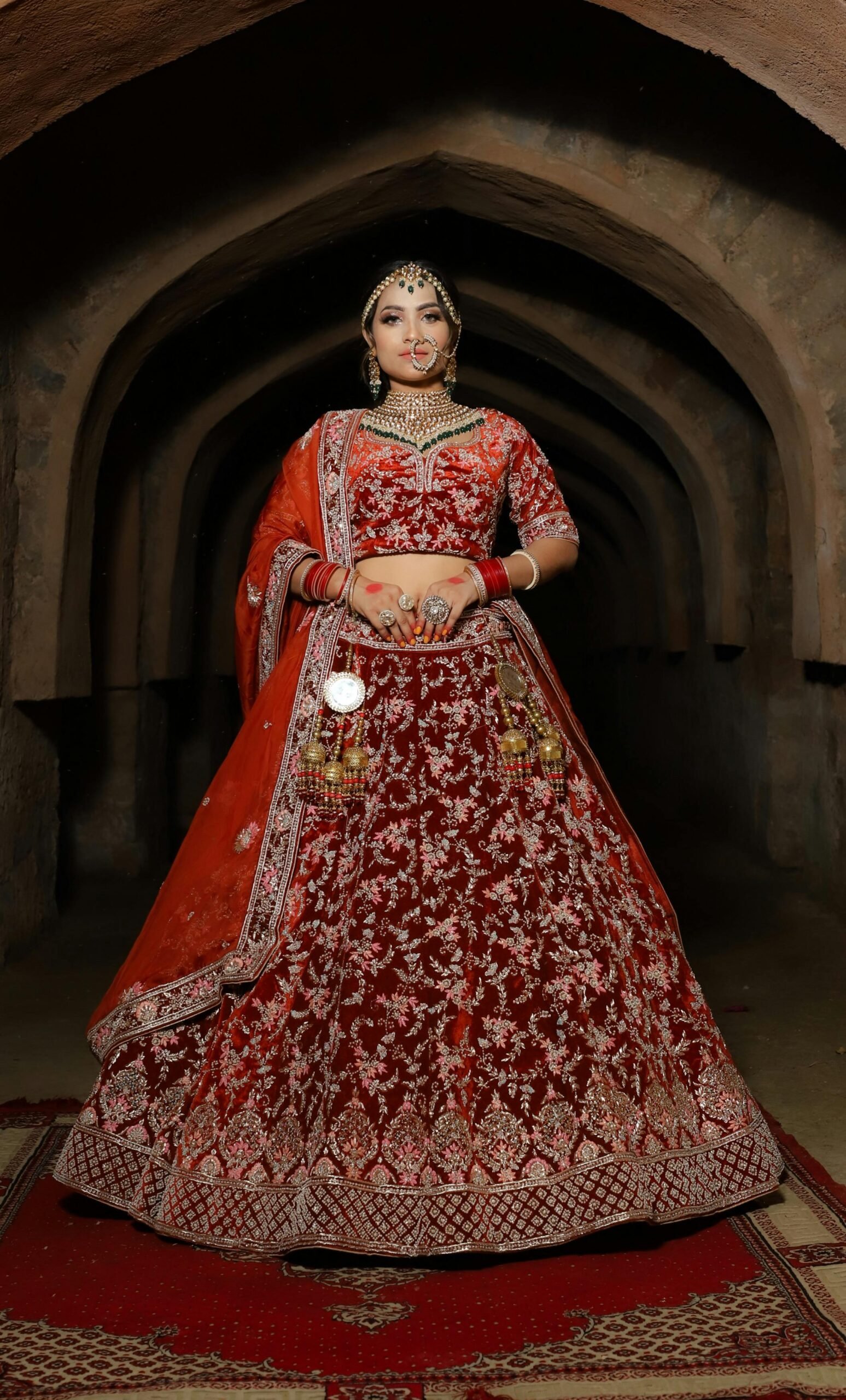 The deep maroon red hue symbolizes love, prosperity, and celebration, making it a perfect choice for bridal wear and grand wedding occasions. The beautifully embroidered choli and gracefully flowing lehenga are complemented by a delicately adorned dupatta, creating a harmonious blend of tradition and luxury.