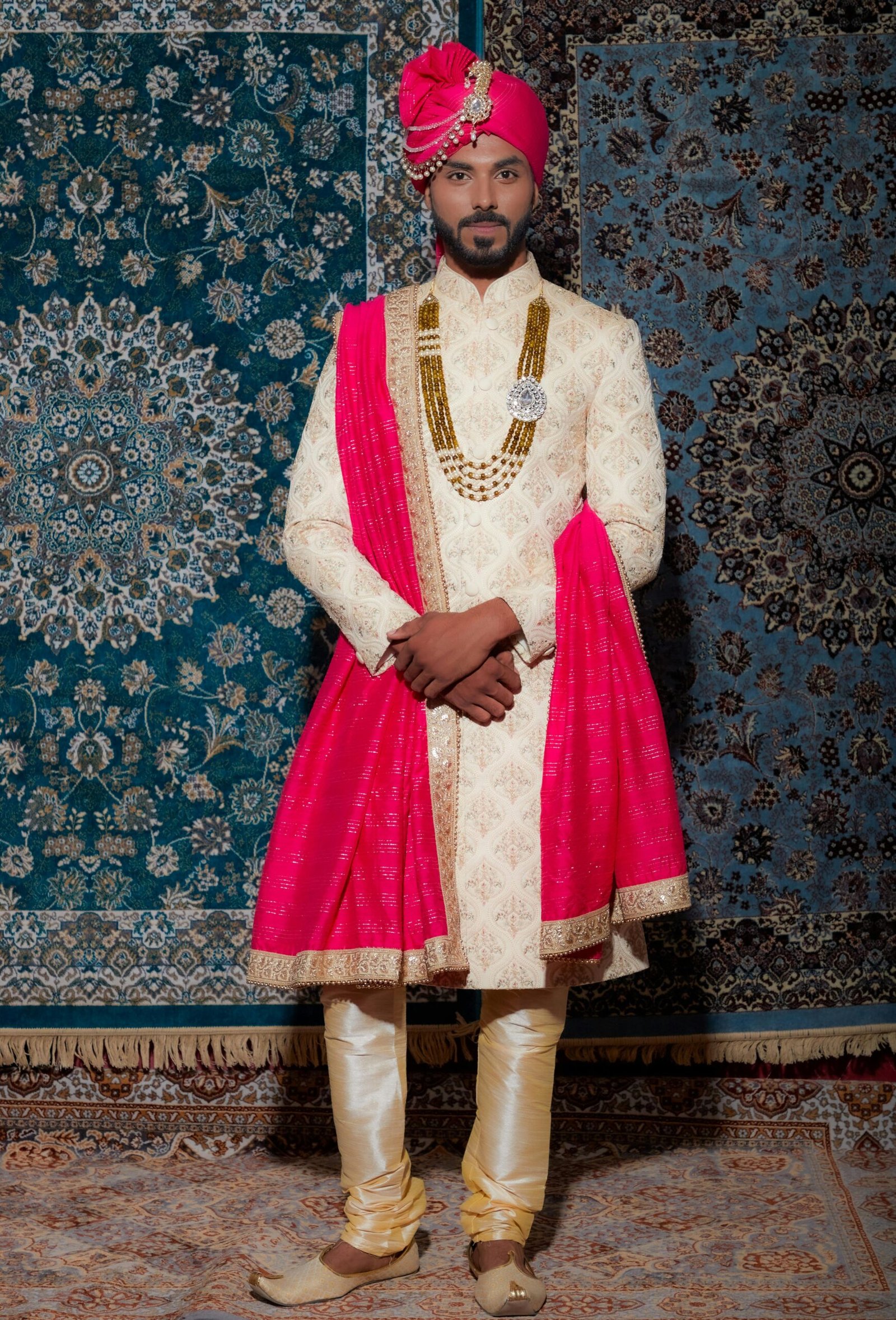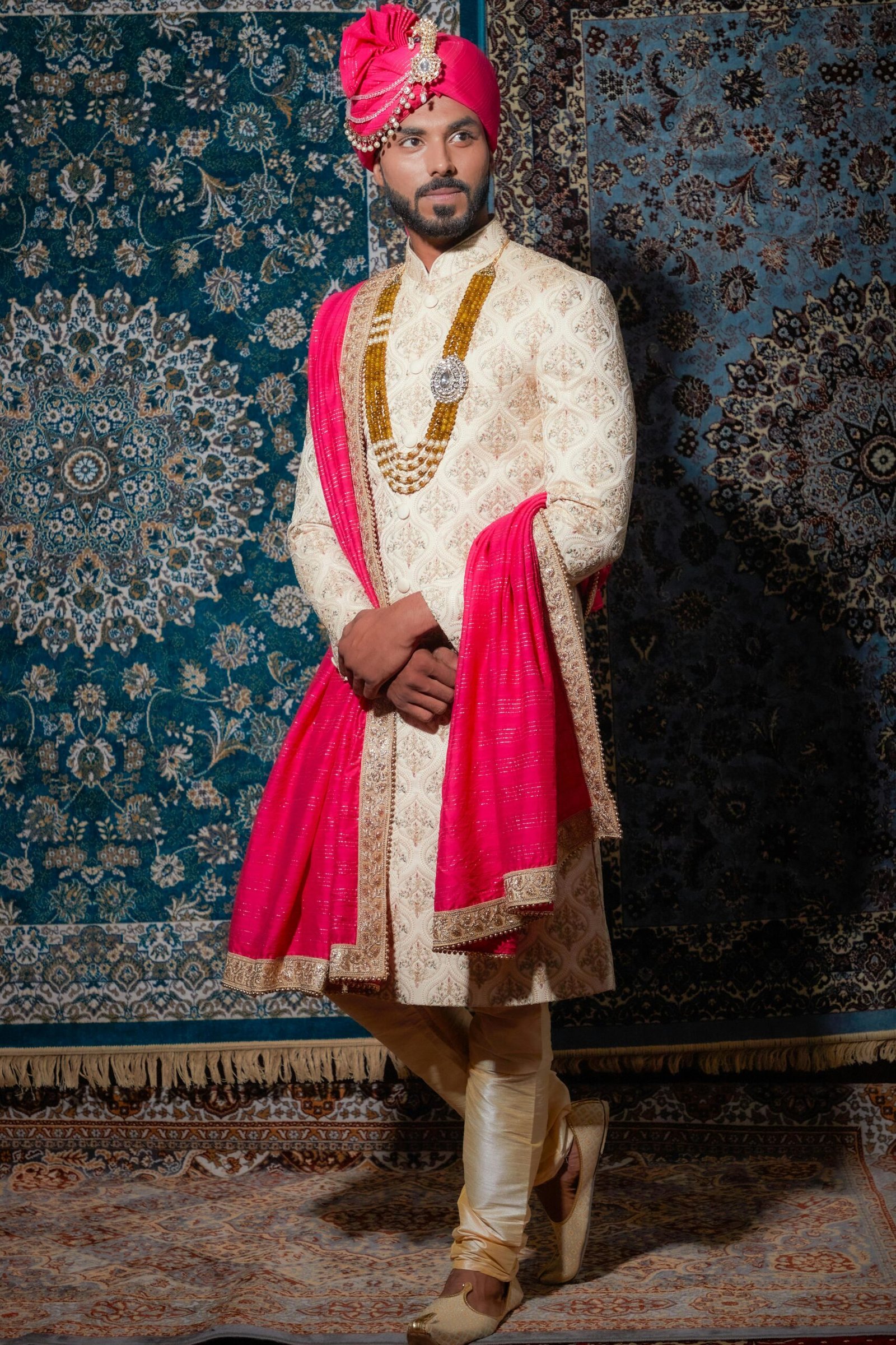 Step into timeless elegance with our Royal Ivory Sherwani Set with Pink Dupatta & Turban, crafted for grooms and festive occasions. This luxurious sherwani features intricate embroidery on premium fabric, offering a rich and graceful look. The contrasting bright pink dupatta and matching turban add a bold royal touch, enhancing the overall appeal.
